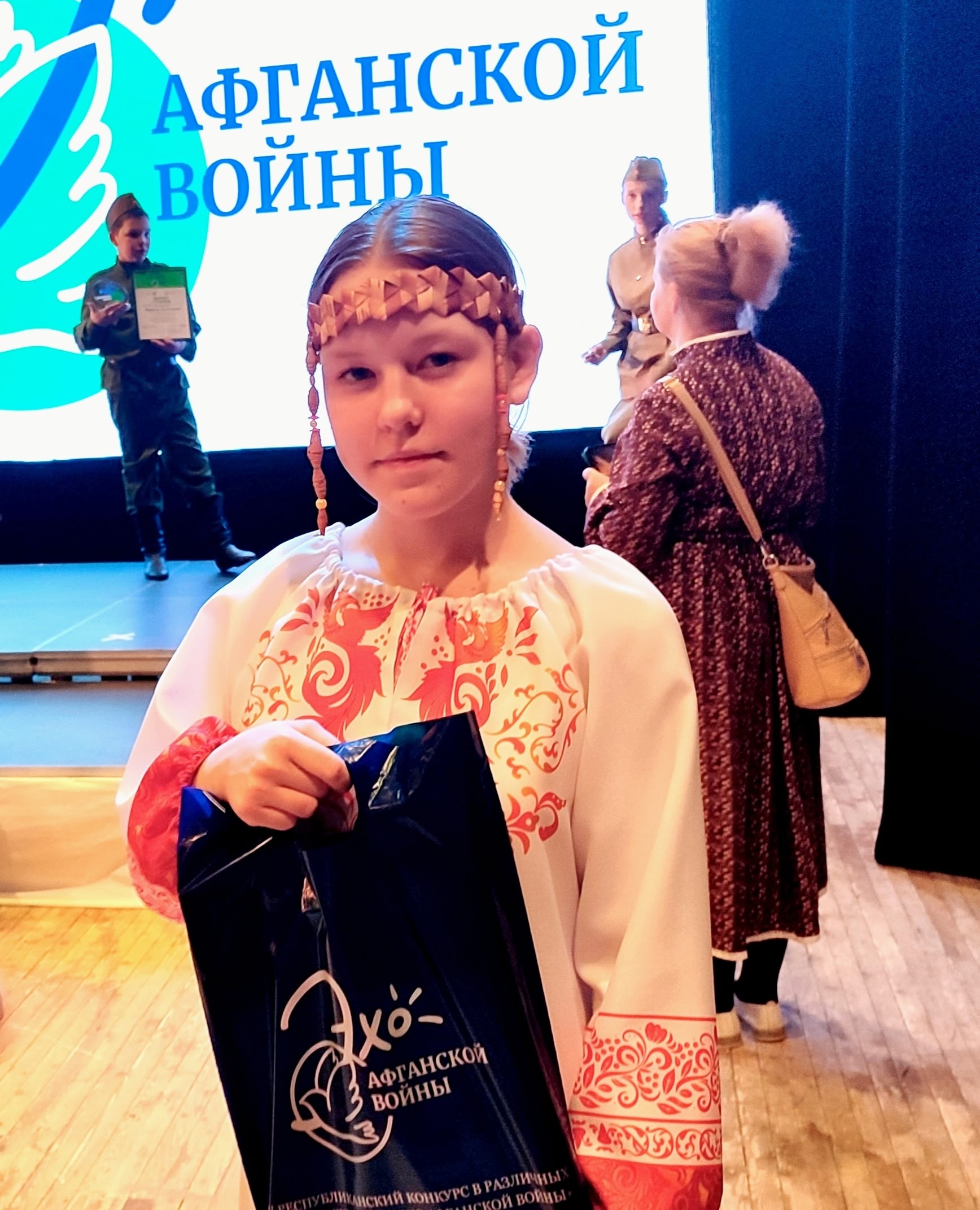 На сцене юные артисты исполняли песни и читали стихи о войне, солдатской доблести, любви к малой родине и долге перед Отечеством. Среди них была и обучающаяся 6 класса МБОУ «Окуневская СОШ» Торопова Агния, которая уже второй раз принимает участие в гала-концерте конкурса «Эхо Афганской войны». В прошлом году она выступила со стихотворением В. Фирсова «Чувство Родины» и стала лауреатом III степени в номинации «Художественное слово». В этом году Торопова Агния стала победительницей в номинации «Художественное слово» в возрастной группе 11-12 лет. На сцене Национального музыкально-драматического театра Агния проникновенно продекламировала простое, но эмоциональное стихотворение В. Тушновой «Вот говорят Россия», которое пробирает до глубины души, до мурашек по коже. «Вот говорят: Россия… Реченьки да березки… А я твои руки вижу, узловатые руки, жесткие…», - взволнованно произносила со сцены наша участница Торопова Агния, и получила заслуженные аплодисменты зрителей.