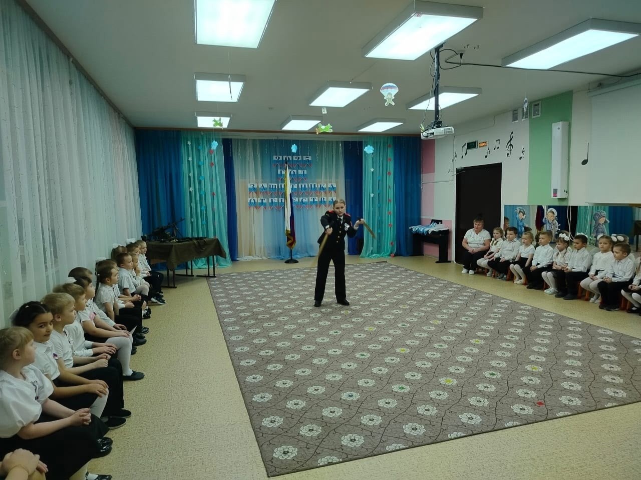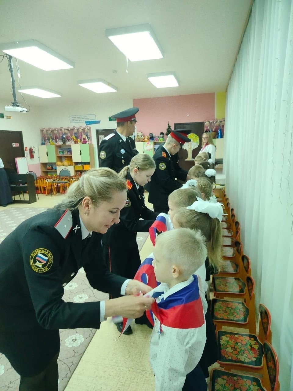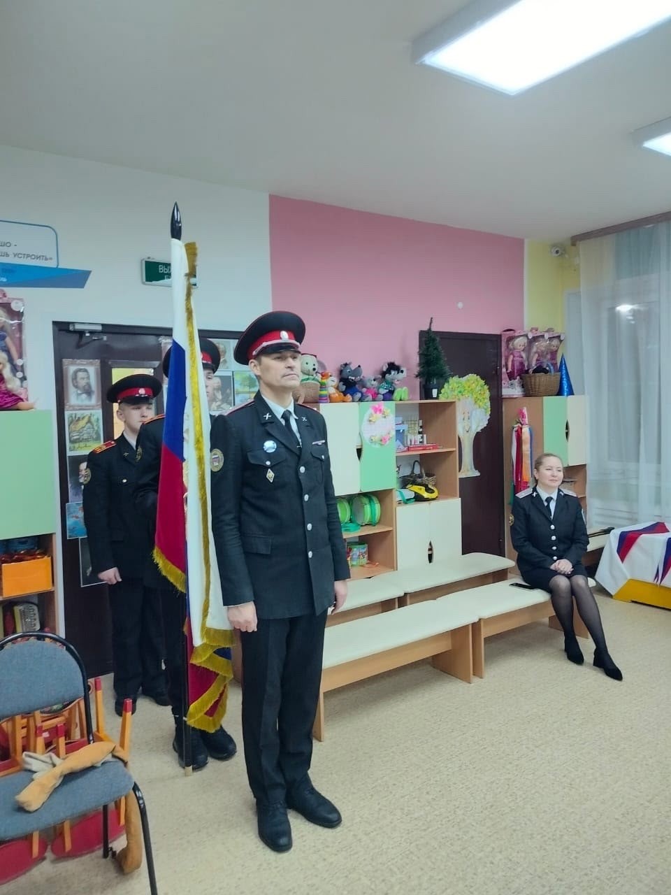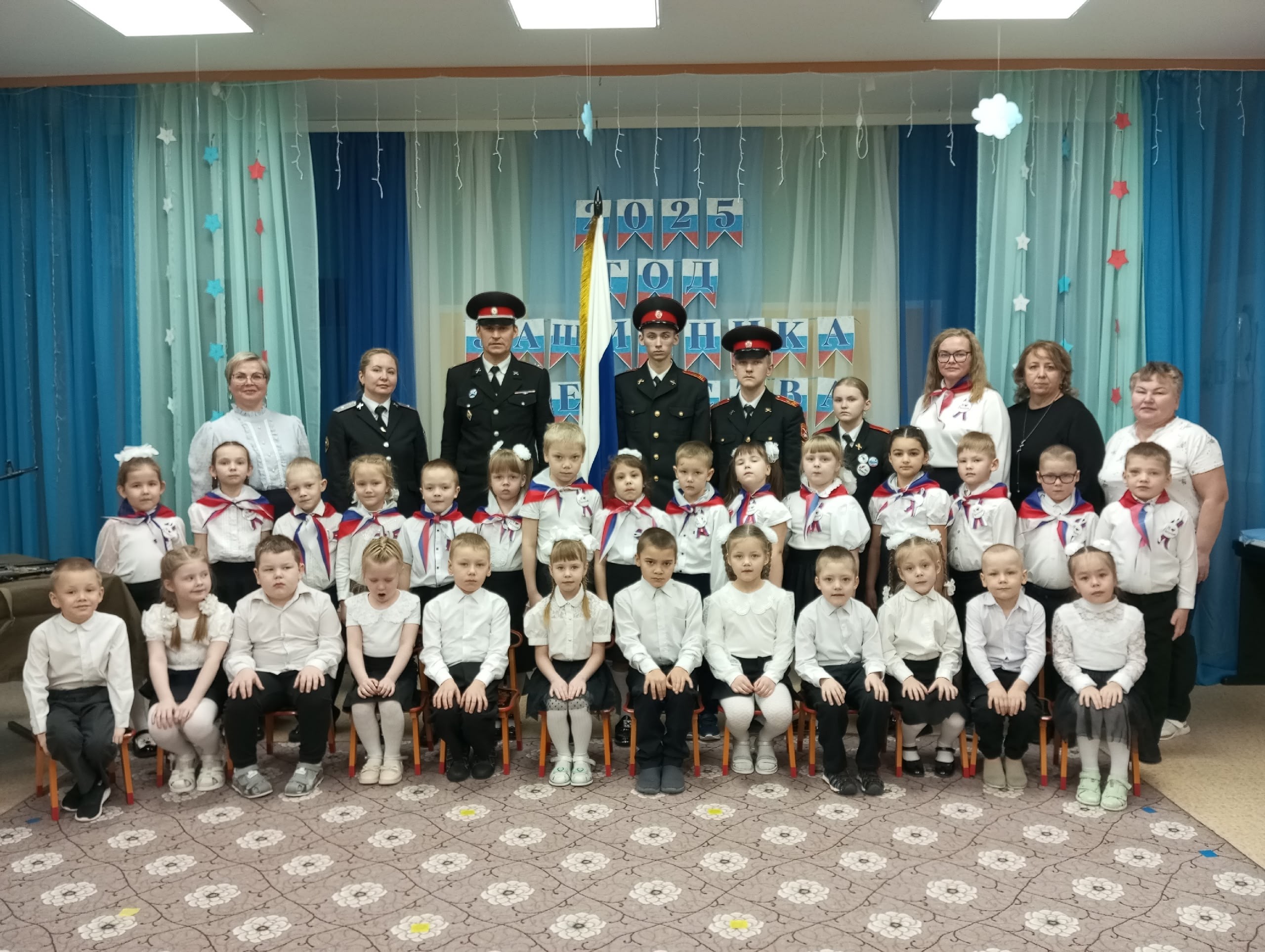 В декабре, накануне Дня героев Отечества, состоялась торжественная церемония посвящения в Юные защитники Родины для воспитанников группы «Сказочный городок» МБДОУ «Детский сад № 5». В этот знаменательный день в гости к дошкольникам приехали обучающиеся МБОУ «Кадетская СОШ им. Героя России В.Н. Носова» во главе с заместителем директора по воспитательной работе Тирановым А.Г. Под торжественную музыку кадеты внесли флаг Российской Федерации, прозвучал гимн России. С приветственным словом выступил Тиранов А.Г., который поздравил ребят, рассказал о празднике, посвящённом героям Отечества, о наших земляках - Героях России и Героях Советского Союза. Также Алексей Геннадьевич показал дошкольникам экспонаты из школьного Музея боевой славы, а ученица Кадетской СОШ Филиппова Полина продемонстрировала воспитанникам мастерство фланкировки, чем заслужила бурные аплодисменты. И вот наступил долгожданный момент – посвящение в Юные защитники Родины. Дошколята были очень собраны, но чувствовалось волнение каждого участники события. Обучающиеся Кадетской СОШ торжественно повязали галстуки своим младшим товарищам. А затем дошкольники, теперь уже в новом статусе, показали строевые навыки: чёткий шаг, дружную речёвку, слаженно исполненную песню.