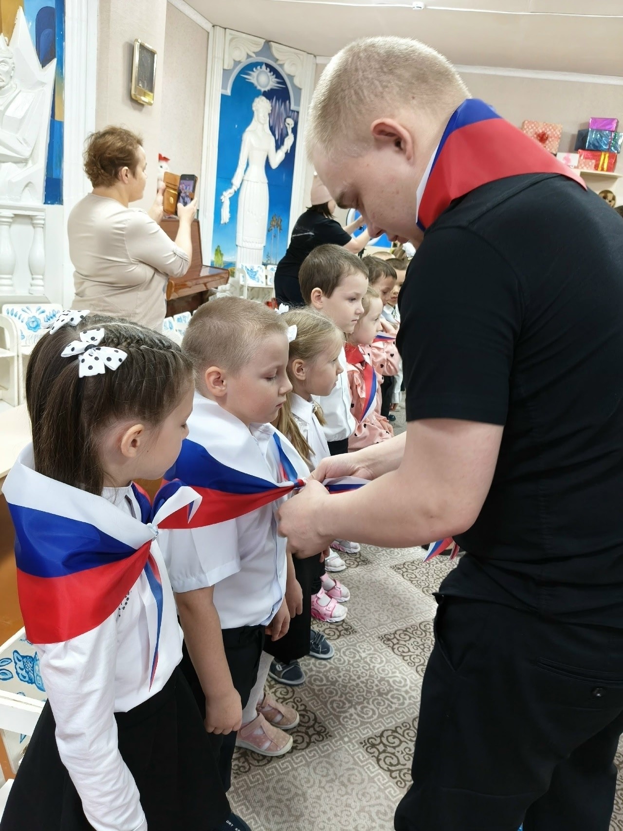 В ноябре торжественная церемония посвящения прошла в МБОУ «Детский сад № 3». Воспитанники подготовительных групп «Барбарики» и «Солнечные зайчики» в начале мероприятия читали стихи о Родине, смотрели видеоклип «С чего начинается Родина», замерев, слушали гимн России. И вот наступил самый ответственный момент – дошкольники хором произнесли девиз Юных патриотов, а затем им повязали галстуки цветов триколора – Государственного флага Российской Федерации. С напутственными словами к ребятам обратились заведующий детским садом Чупрова Н.И. и участник СВО Поздеев Д.И. Они призвали дошкольников любить свою Родину, помнить и гордиться нашей историей, чтить имена героев.