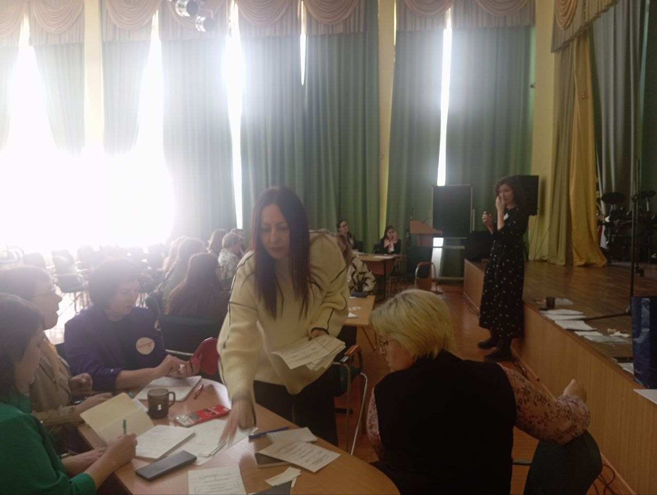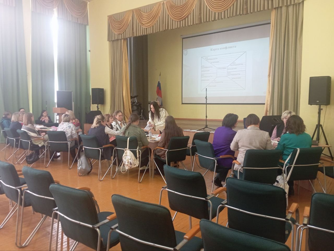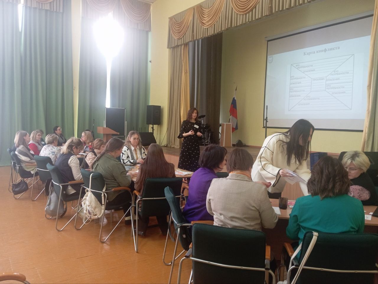 В первый день мероприятия нашим коллегам рассказали об использовании медиативных техник и стратегий в профессиональной практике педагога. Все мы знаем, что главные фигуры в школе – учитель и ученик. Их общение на уроке, во внеклассной работе, на досуге становятся важным условием эффективности учебно-воспитательного процесса, средством формирования личности школьника. Но, как и в любом коллективе, нередко между учителем и учеником отношения не складываются, возникают конфликты. Поэтому специалисты Республиканского центра образования во время семинара предлагали нашим педагогам разобрать различные конфликтные ситуации, показывали способы, как не вступать в конфликты, а уж если он всё-таки произошёл, то рассказывали, как из него выходить.